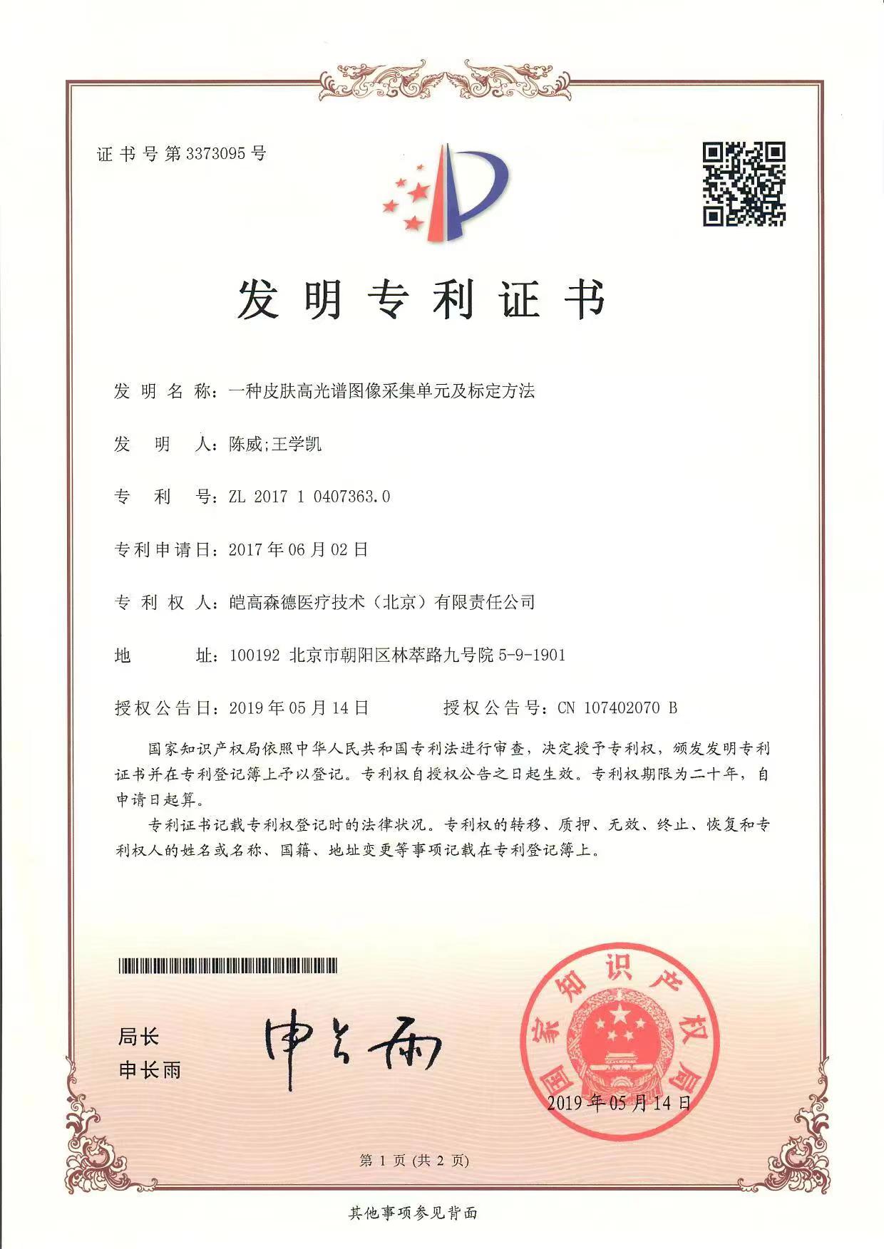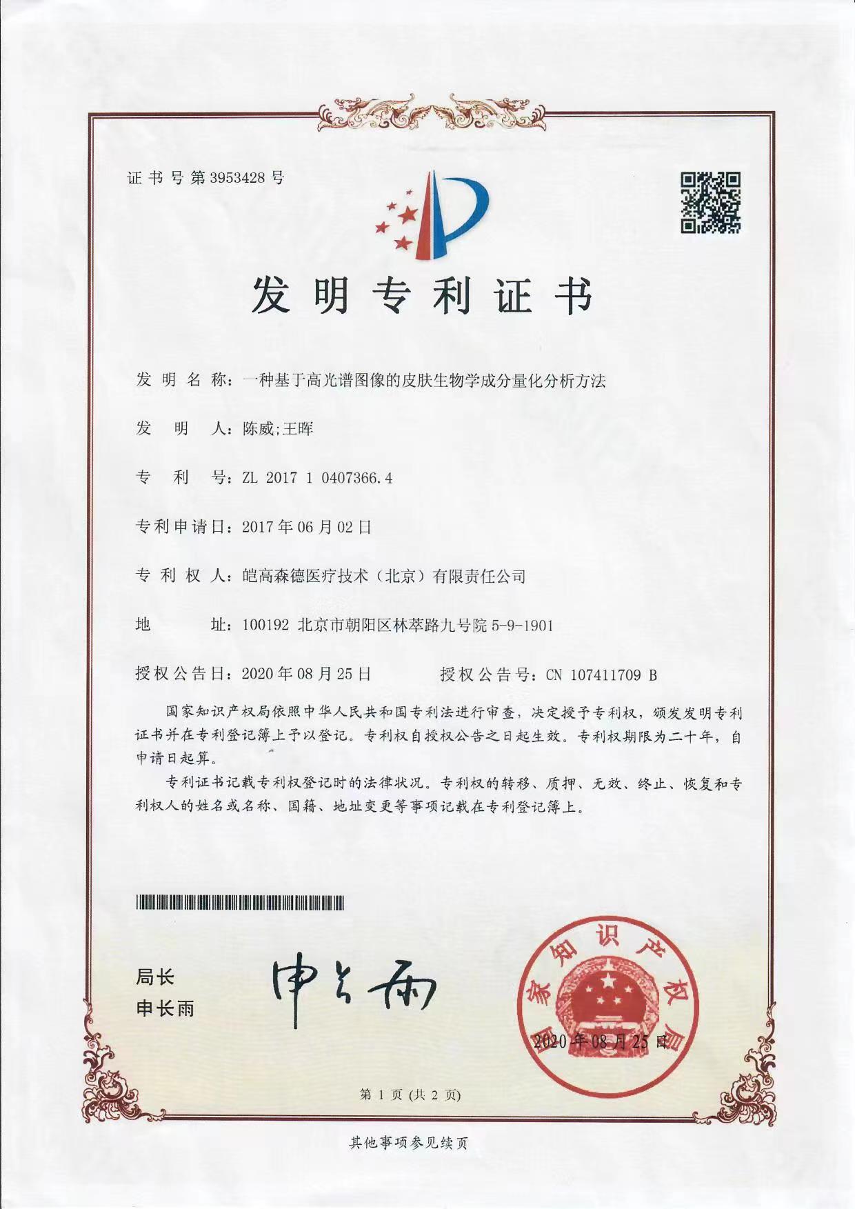 天健投資的皚高森德醫(yī)療技術(shù)(北京)有限責(zé)任公司自主研發(fā)的AI智能診療系統(tǒng)是自主研發(fā)的實(shí)現(xiàn)皮膚成分無(wú)創(chuàng)定量檢測(cè)的系統(tǒng),目前,已獲得多項(xiàng)發(fā)明專利(專利號(hào):ZL2016 1 0181986.6;專利號(hào):ZL 2017 1 0407363.0;專利號(hào):ZL 2017 1 0407366.4;專利號(hào):ZL 2016 1 0182873.8),系統(tǒng)中基于皮膚高光譜圖像能夠精準(zhǔn)檢測(cè)人皮膚的五類19個(gè)皮膚參數(shù),建立了人皮膚系列的客觀評(píng)價(jià)指標(biāo),支持人體皮膚光學(xué)成分的形態(tài)學(xué)量化分析,是皮膚病診查從定性轉(zhuǎn)為定量的硬科技。