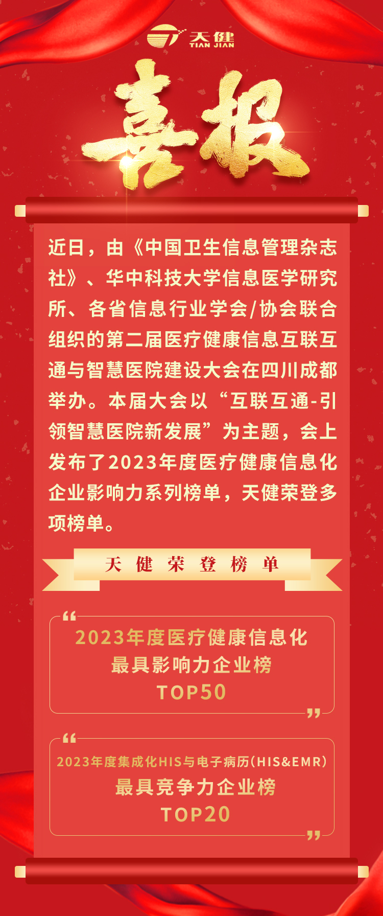 天健榮登“2023年度醫(yī)療健康信息化企業(yè)影響力系列榜單”