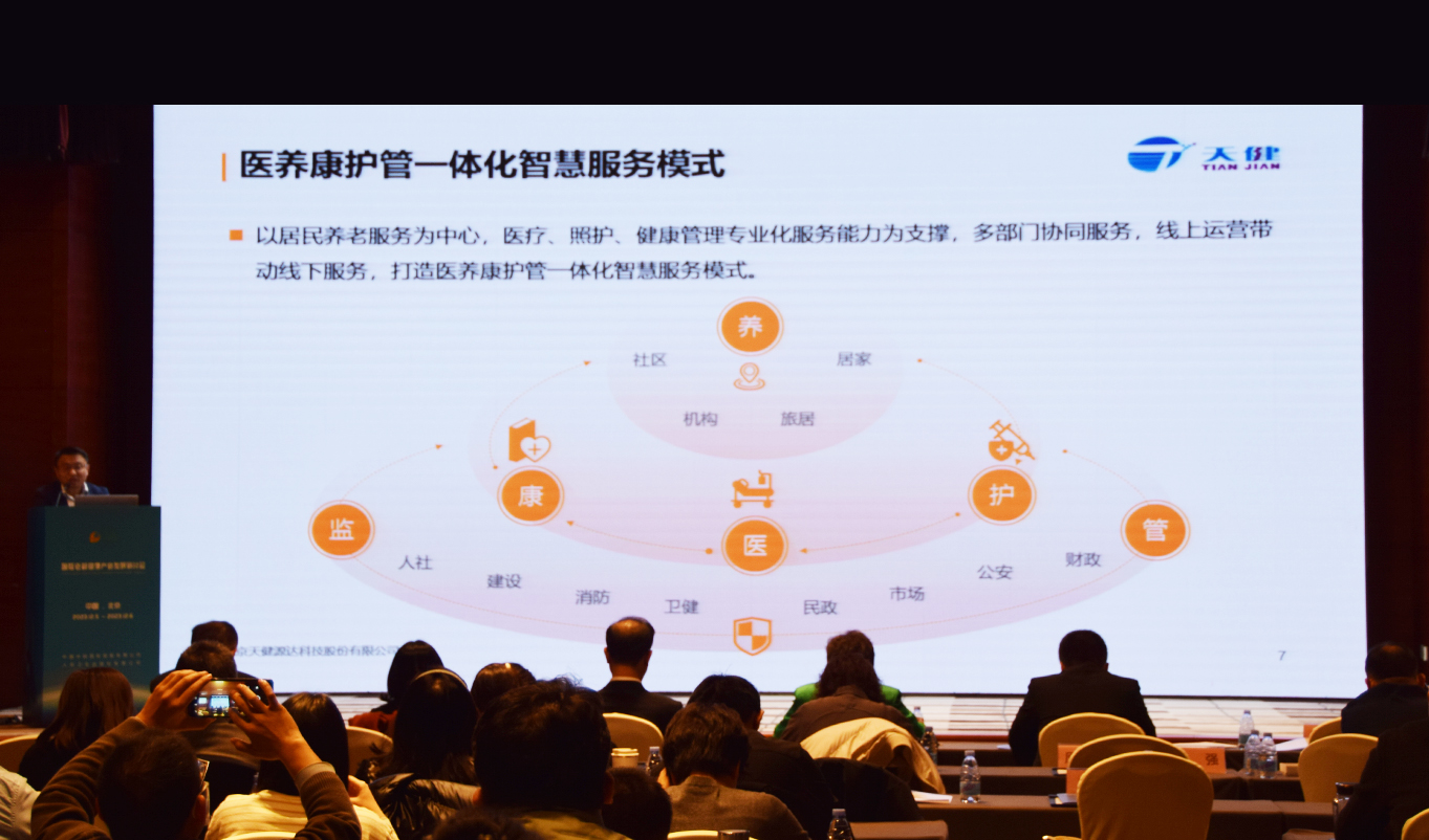 12月6日,由保利集團(tuán)中國輕工集團(tuán)有限公司聯(lián)合人民衛(wèi)生出版社有限公司共同組織舉辦的“國際老齡健康產(chǎn)業(yè)發(fā)展研討會”在北京召開。會上,國家衛(wèi)生健康委老齡健康司、全國老齡工作委員會相關(guān)領(lǐng)導(dǎo)出席并致辭,來自中國人民大學(xué)、南海健康產(chǎn)業(yè)研究院等國內(nèi)外知名養(yǎng)老專業(yè)進(jìn)行了主題演講,天健作為智慧康養(yǎng)行業(yè)代表企業(yè),進(jìn)行了“構(gòu)建醫(yī)養(yǎng)康護(hù)管一體化智慧服務(wù)模式”為主題的案例分享。